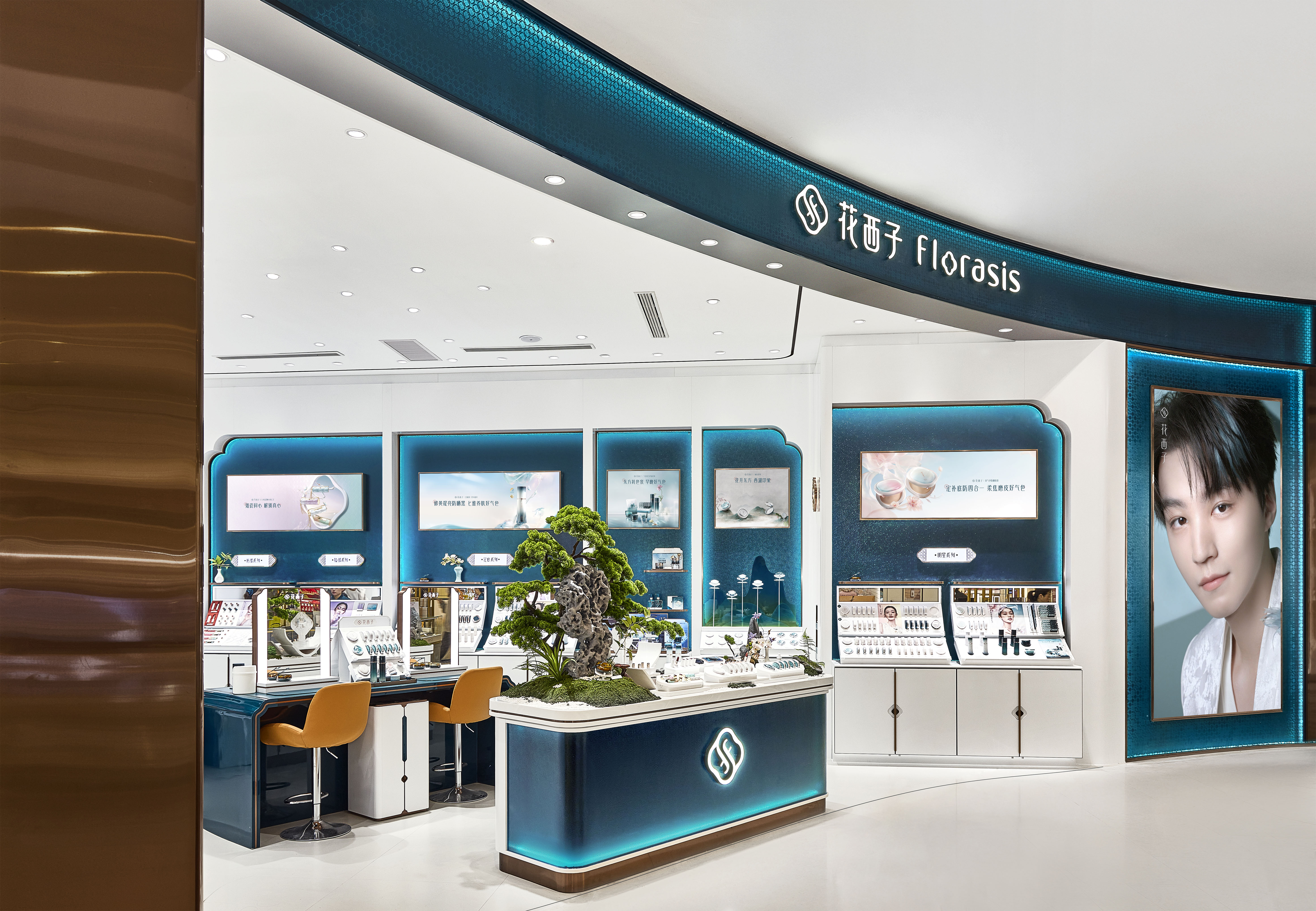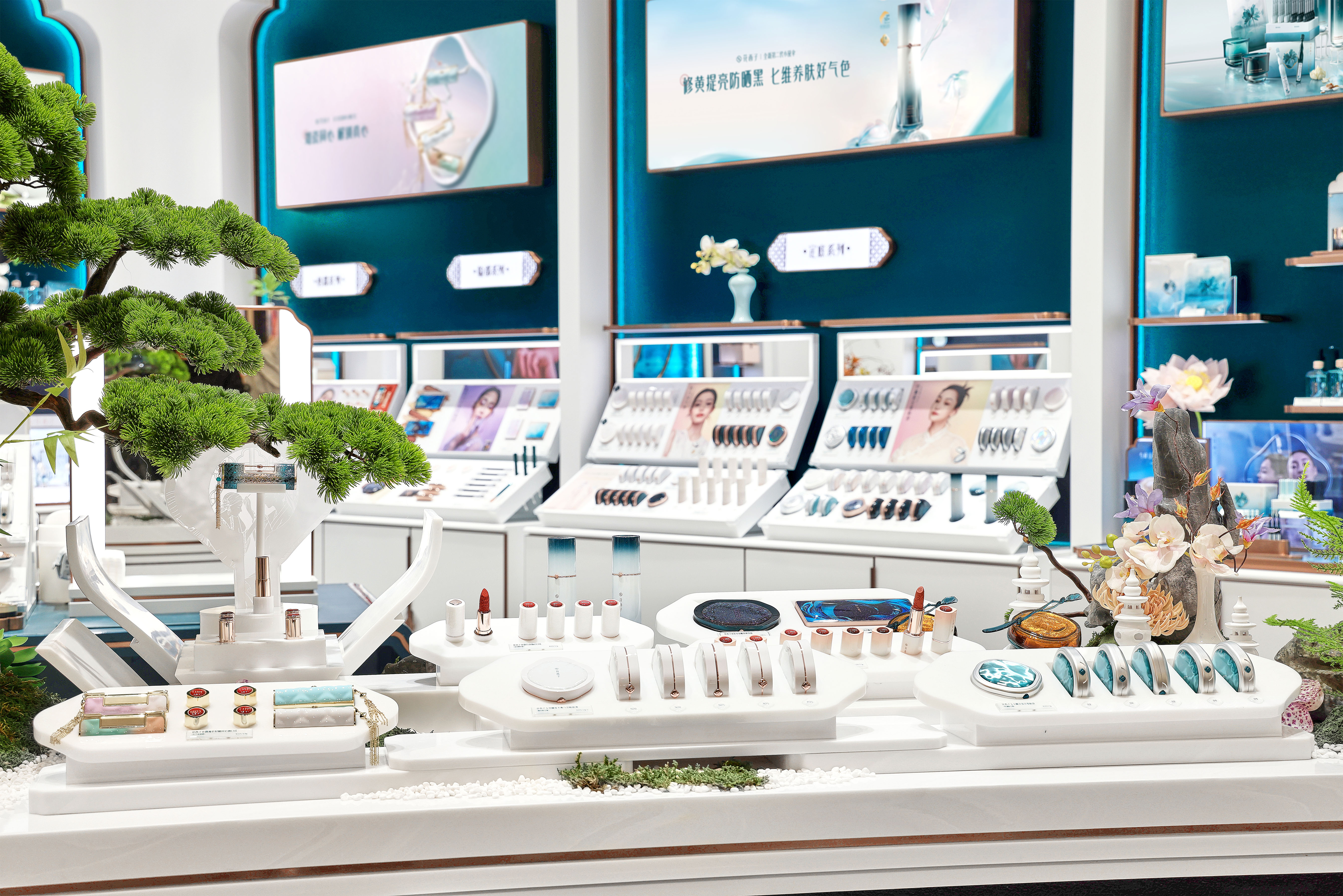 作为中国零售百货业的标杆,银泰百货自2020年以来不仅是中国最大的化妆品实体零售商,更已成为众多城市的商业地标和深受市民青睐的购物目的地。花西子门店位于杭州城西银泰百货一层时尚名品专区。步入店内,轩窗、琉璃、水墨山影等元素扑面而来,巧妙融入园林造景意境,中心柜台以三潭印月城市元素为点缀,打造出一个兼具东方园林韵味与现代风尚的美妆零售空间。