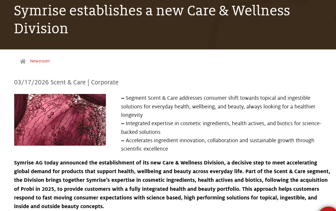 3 月 17 日,全球领先的香料与原料巨头 Symrise AG(德之馨)正式宣布,在其Scent & Care(香氛与护理)业务板块下全新成立Care & Wellness(护理与健康)事业部。
