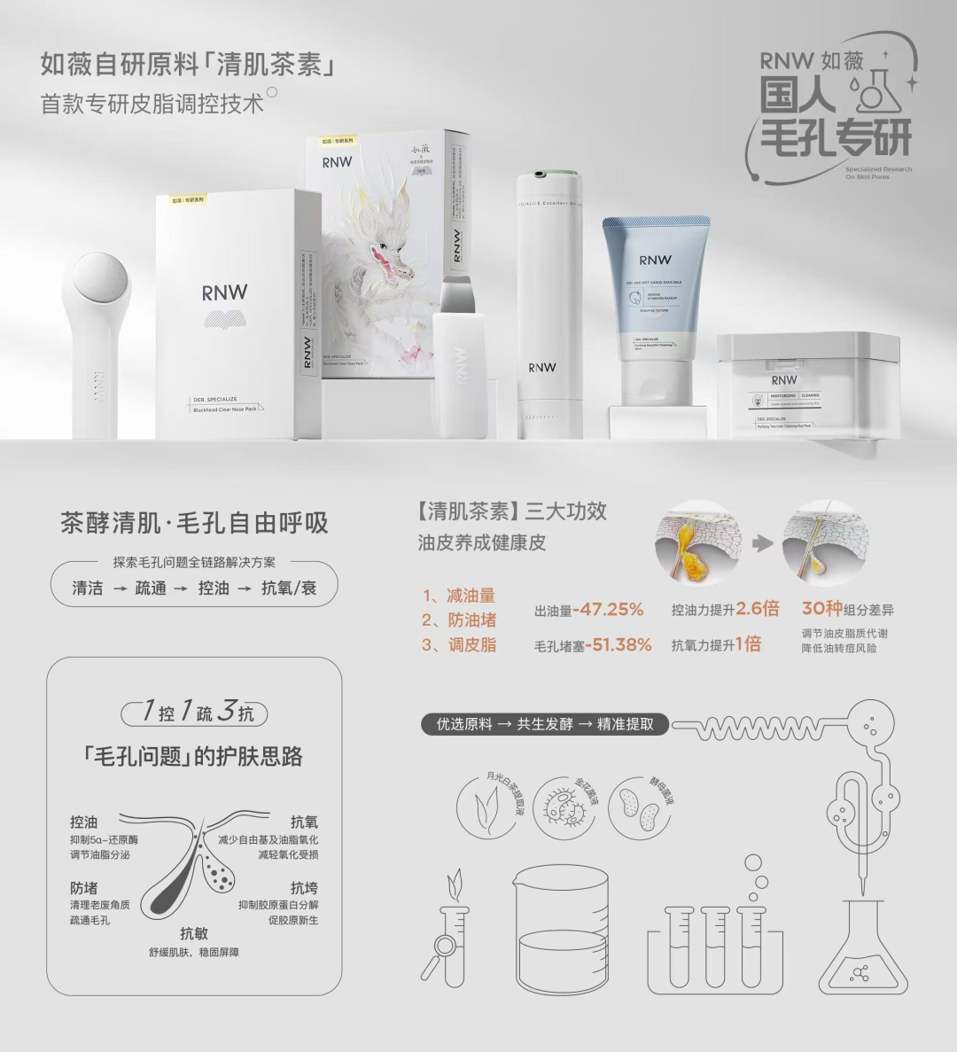 同时,如薇坚持以用户需求为研发原点,依托深厚的科研实力,已建立起涵盖多项自主技术的核心研发矩阵,持续夯实品牌的创新根基。其中,专门针对油性易痘肤质研制独家成分「清肌茶素」:选用云南月光白茶,结合专利菌种,创新采用金花菌、布拉氏酵母菌两种自有益生菌120小时拟态共生发酵工艺,将茶叶活性成分转化成更易皮肤利用的物质,经实测可温和改善肌肤出油、毛孔堵塞问题,无需猛药成分、无需撕拉式损伤,就能精准适配国人肤质特点,从根源解决油脂旺盛、黑头、毛孔粗大等核心痛点。
