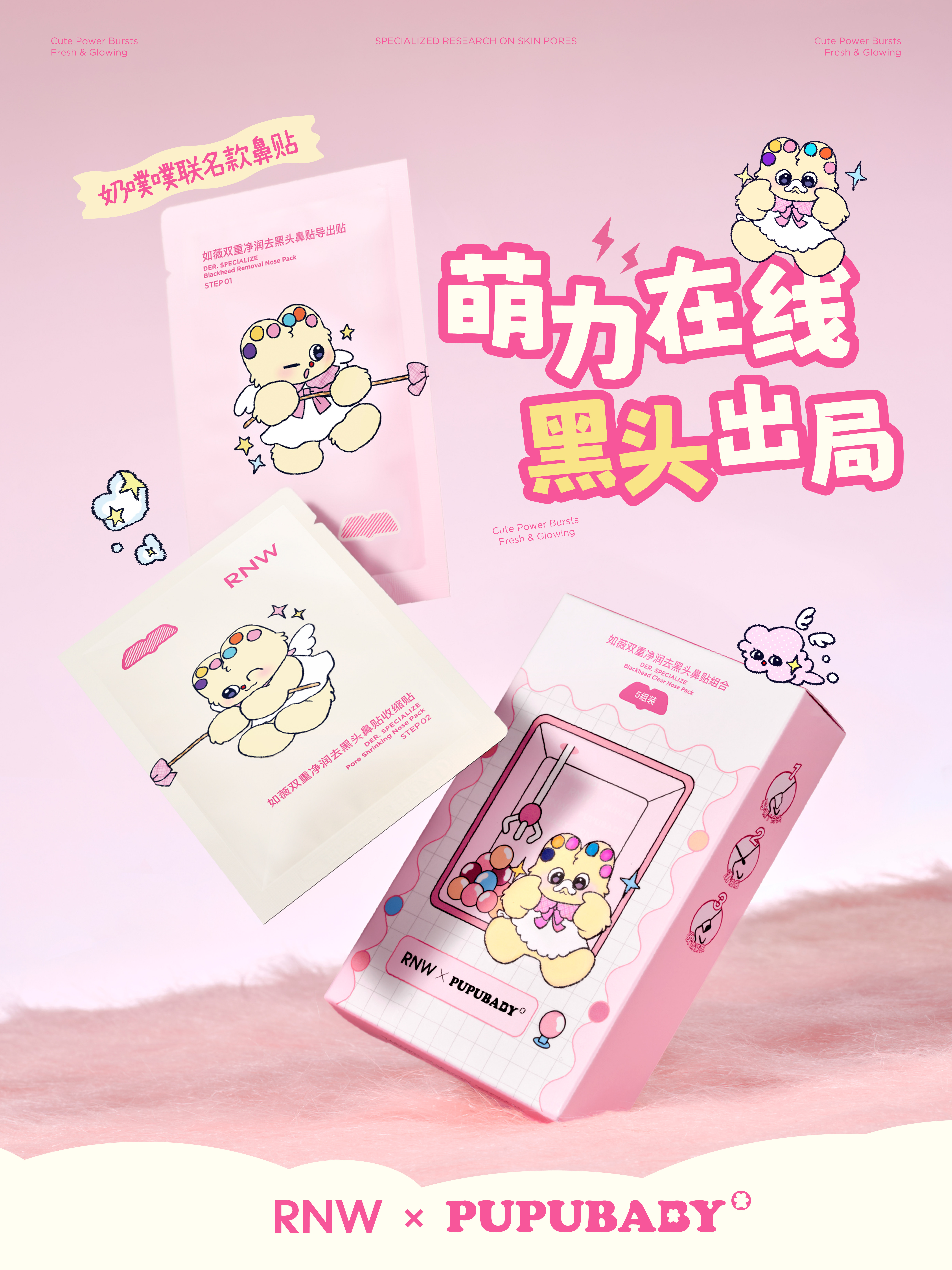基于这份内核共鸣,本次联名系列集结了去黑头鼻贴、黑头水、抛光洗面奶、玻尿酸补水面膜等多款明星单品,从软萌治愈的包装设计,到贴合年轻人喜好的潮流视觉表达,如薇将奶噗噗的治愈感融入产品的每一处细节,通过跨界联名焕新了毛孔护理的全场景体验,真正实现了「精准护肤」与潮流美学的深度融合。