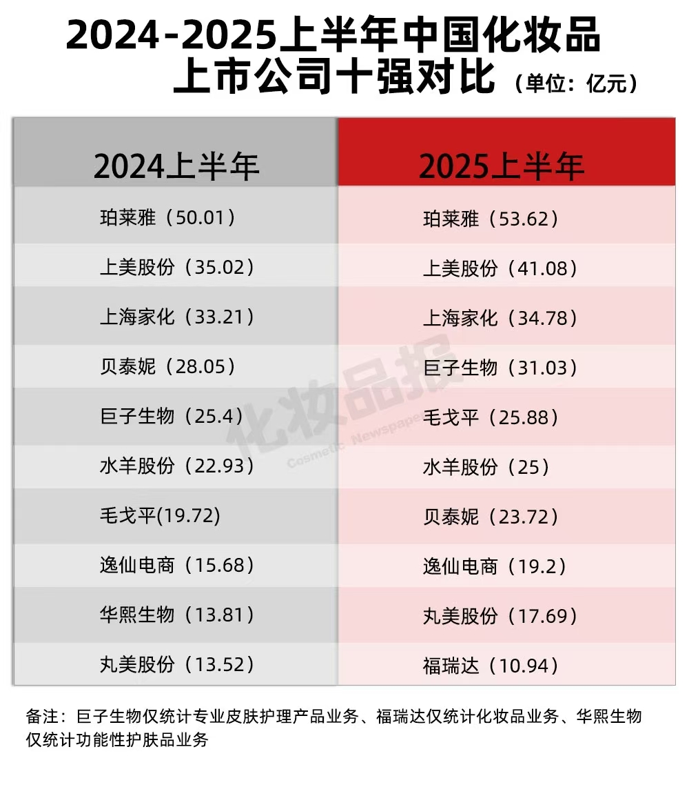 据《化妆品报》统计,剥离非化妆品业务后,2025上半年,中国营收前十的化妆品公司依次是珀莱雅、上美股份、上海家化、巨子生物、毛戈平、水羊股份、贝泰妮、逸仙电商、丸美股份、福瑞达。10家公司上半年营收总体量达282.94亿元,去年同期中国美妆前十营收总额为257.35亿元,同比增长9.94%。