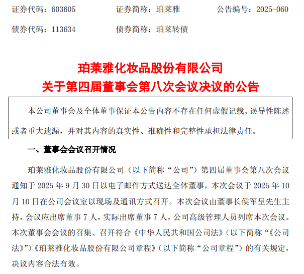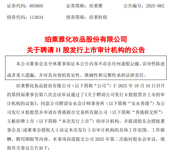 10月11日,珀莱雅发布公告称,公司董事会审议通过了《关于聘请公司发行 H 股股票并上市的审计机构的议案》(以下简称“《议案》”),并计划召开2025年第二次临时股东大会,对上述事宜进行最终审议。