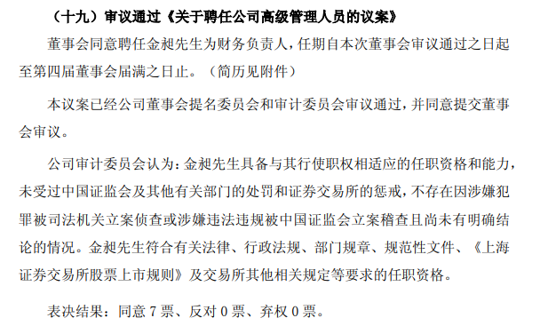 与港股上市计划同步披露的,是一项关键人事任命。珀莱雅董事会审议通过,将聘金昶为公司财务负责人,任期自本次董事会审议通过之日起至第四届董事会届满之日止。
