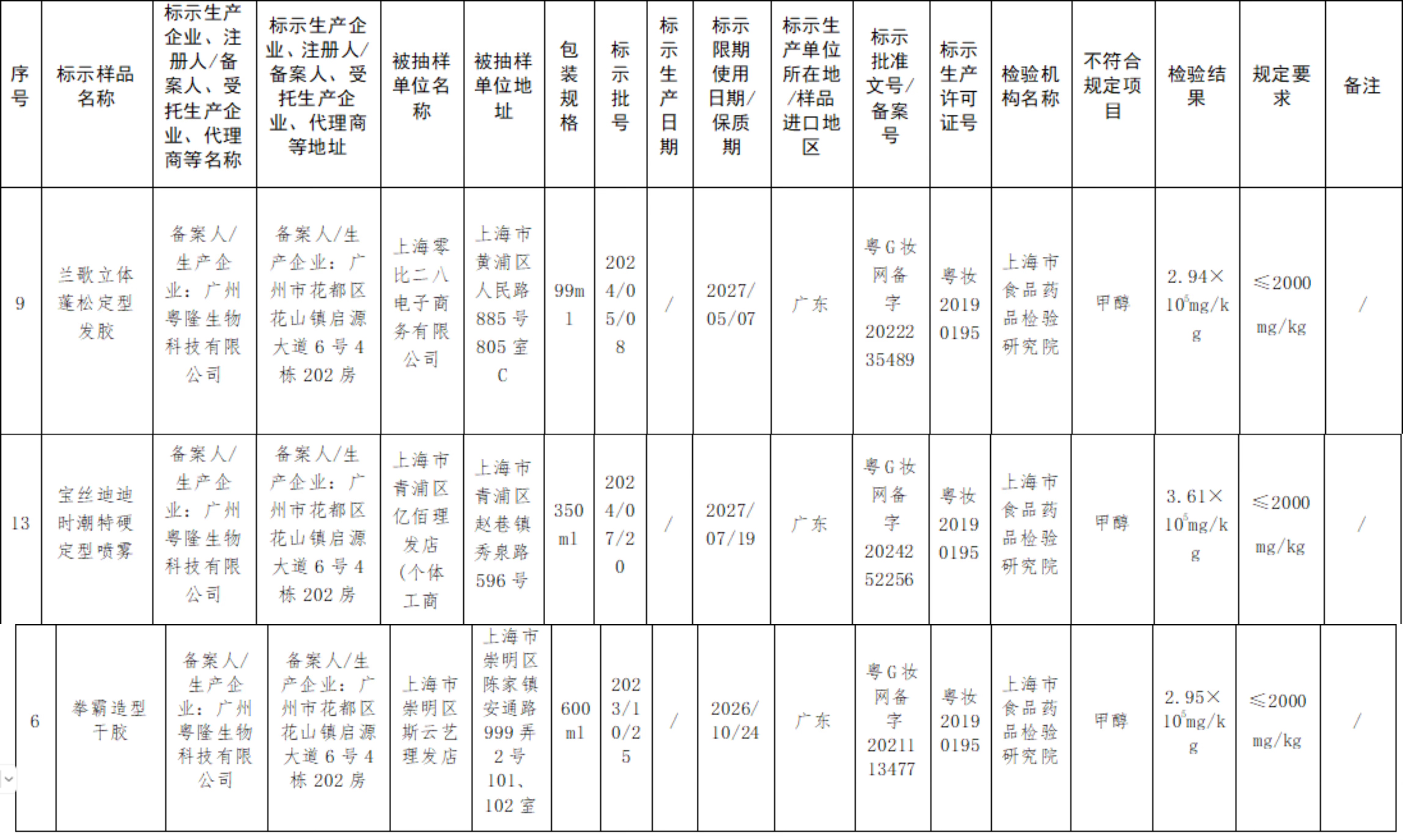 其中,上述前3批次发型定型类产品的备案人/生产企业均为广州粤隆生物科技有限公司(以下简称“广州粤隆”)。该公司并不是“初犯”,在上海市监局发布的关于2024年第1期化妆品监督抽检质量通告中,广州粤隆生产的“拳霸造型干胶”上榜,彼时公司对样品真实性提出异议;在2023年第1期通告中,也出现广州粤隆生产的“尚雅丝造型干胶”,不合格原因仍为产品中甲醇含量超标。