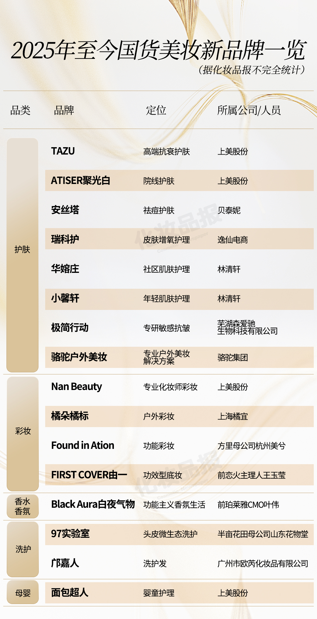 化妆品报发现,白夜气物是今年首个布局香氛赛道的国货新品牌。据不完全统计,2025年至今,共有16个国货美妆诞生。其中,头部企业领衔,上美股份今年已推出4个新品牌——高端抗衰品牌TAZU、专业化妆师品牌Nan Beauty、院线护肤品牌聚光白、大众婴童护理品牌面包超人;橘朵、方里、半亩花田等新锐品牌的母公司也开始纷纷打造第二曲线,以扩充品牌矩阵,抢占市场高地。
