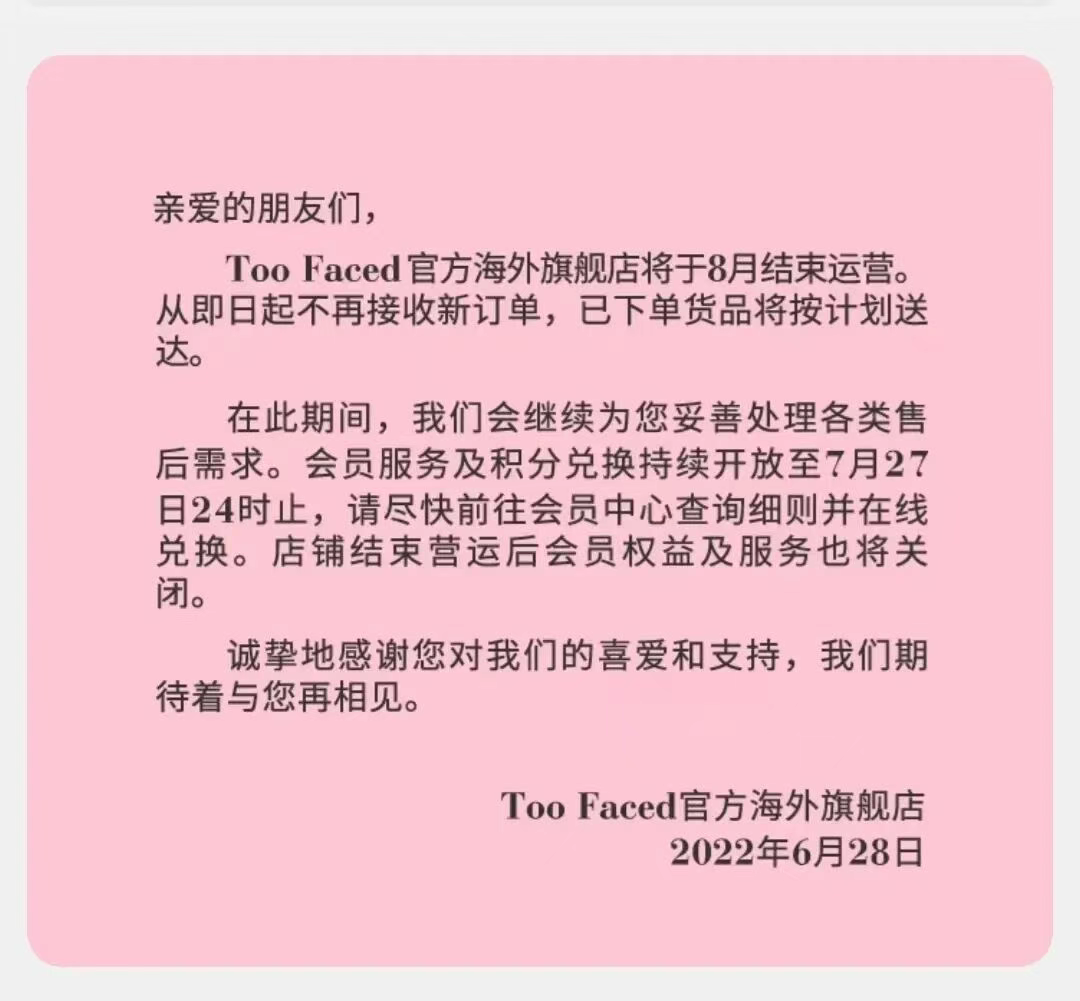 因本土化运营不足,2023年6月,Too Faced运营商ELC Japan在品牌网站上公布,将于2023年年底前结束所有商店和电子商务网站的销售,彼时品牌在日本市场的经营时长不到4年。