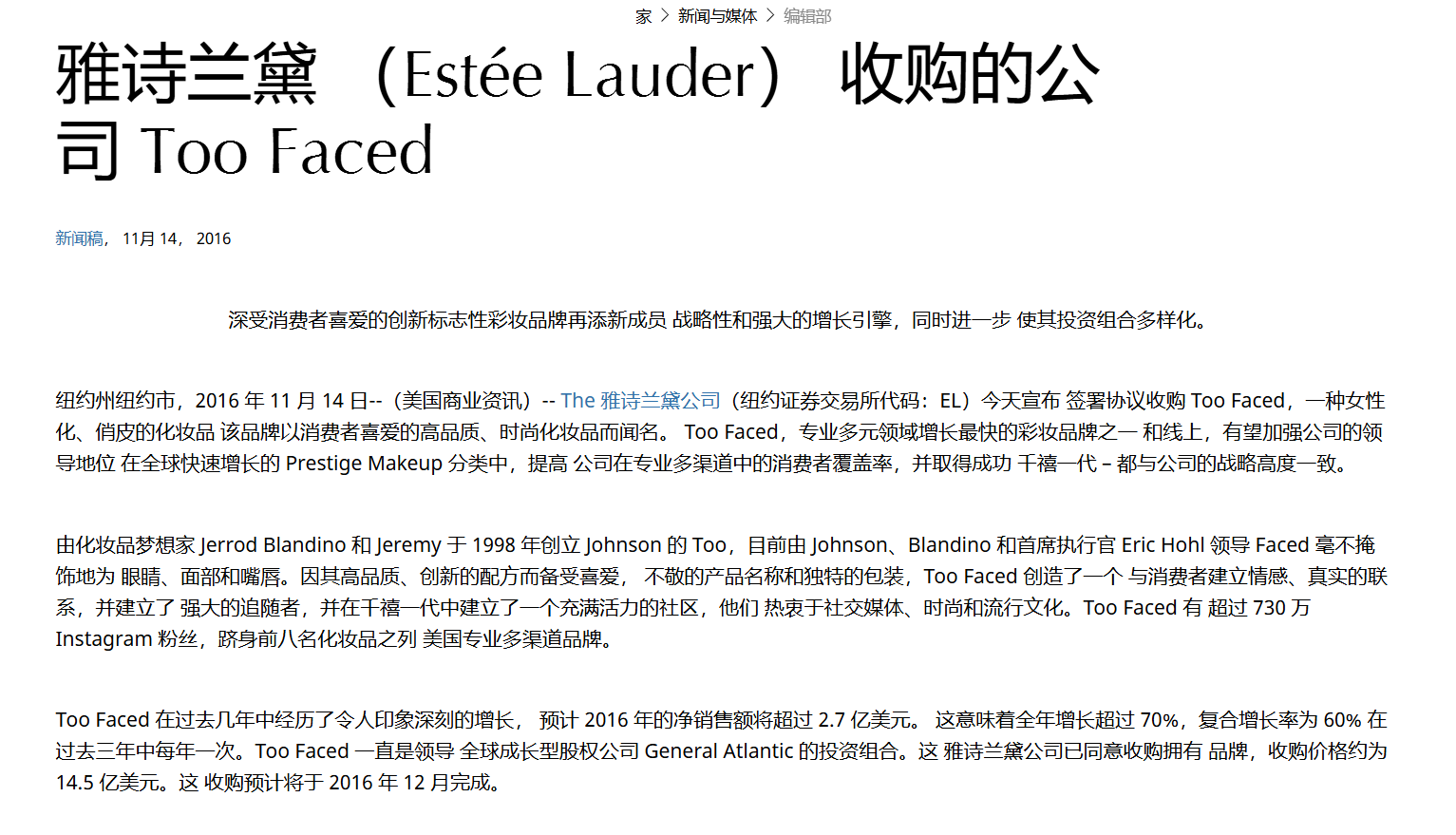 公开资料显示,Too Faced创立于1998年,作为美国知名彩妆品牌,其于2016年被雅诗兰黛以14.5亿美元(约合人民币103.34亿元)高价收入麾下,彼时创下雅诗兰黛最高收购记录。根据NPD集团2022年数据,Too Faced已成为美国第七大知名化妆品品牌。