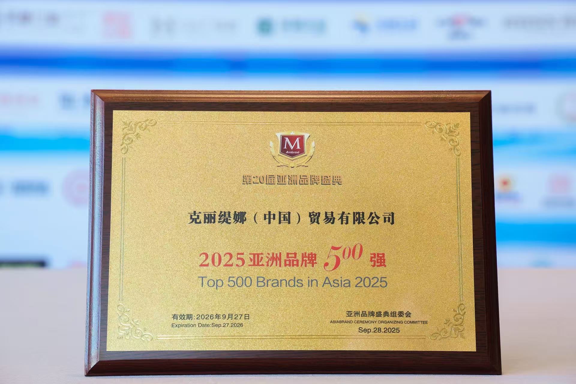 △克丽缇娜“2025亚洲品牌500强”认证